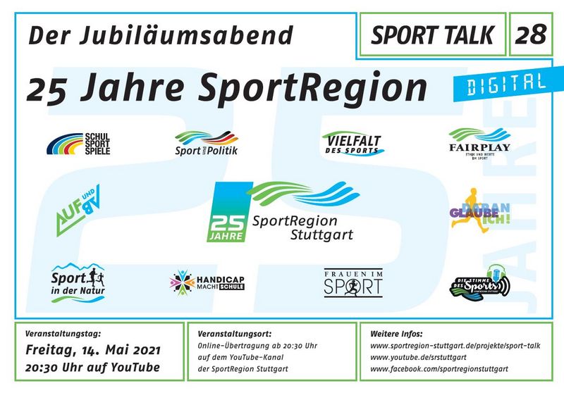 Am Freitag (14. Mai 2021) jährt sich der Gründungstag der SportRegion Stuttgart zum 25. Mal. Daher wird an jenem Tag erstmals überhaupt ein SPORT TALK in rein digitaler Form durchgeführt. Die Namen der Gäste sind noch „unter Verschluss“, schließlich soll der Jubiläumsabend, an dem ausführlich auf die Geschichte der SportRegion geblickt wird, ja auch einige Überraschungen bereithalten. Einzig der Moderator steht fest: Daniel Räuchle von Regio TV wird am Freitag durch das abwechslungsreiche Programm führen. Gesendet wird ab 20.30 Uhr auf dem YouTube-Kanal der SportRegion Stuttgart.