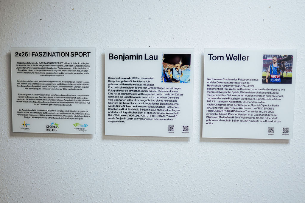Es geht weiter! Auf Filderstadt folgt Sersheim! Mit der Ausstellungsreihe 2x26 | FASZINATION SPORT widmet sich die SportRegion Stuttgart im Jahr 2026 der zeitgenössischen Fotografie. Benjamin Lau und Tom Weller, beide vielfach ausgezeichnete Fotografen, haben jeweils 26 ihrer besten Werke ausgesucht. Diese werden nun im Jahr 2026 in mehreren Kommunen der Region Stuttgart zu sehen sein. Zum Auftakt gastierte 2x26 | FASZINATION SPORT in Filderstadt. Die Ausstellung wurde am 26. Januar 2026 eröffnet und die Exponate waren in der Folge dort zu sehen. Nun steht die nächste Station an. Von Filderstadt aus geht es in den Landkreis Ludwigsburg nach Sersheim, wo die Bilder im März im dortigen Rathaus ausgestellt werden. Benjamin Lau und Tom Weller zählen zu den profiliertesten Fotografen ihrer Generation. Ihre Arbeiten wurden national und international ausgezeichnet und in renommierten Medien sowie Ausstellungen veröffentlicht.