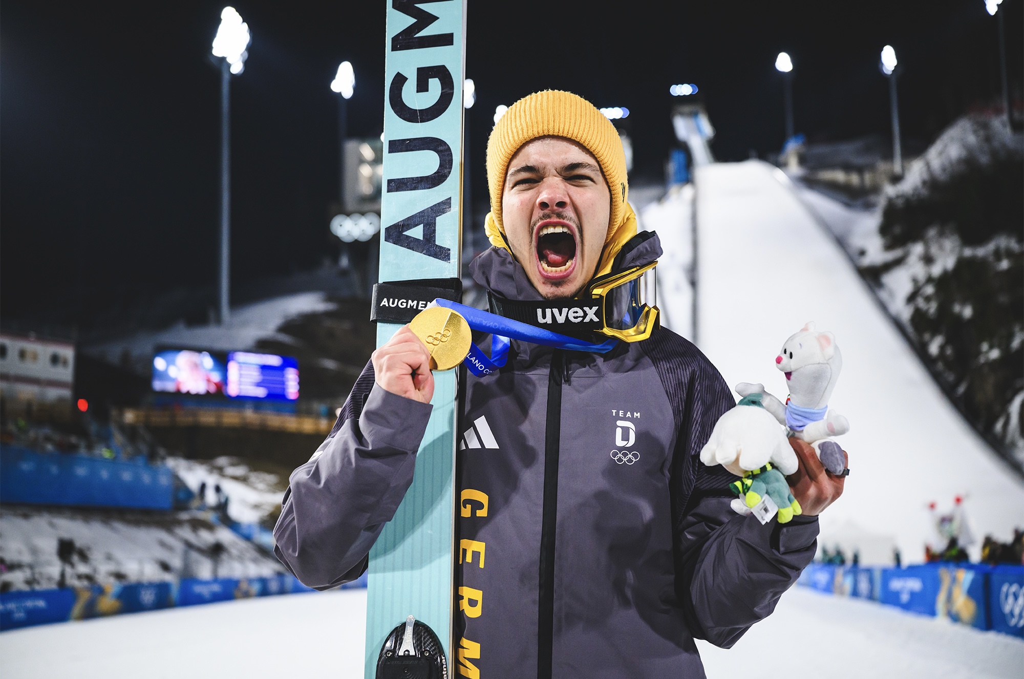 „Gold für Deutschland! Skispringer Philipp Raimund ist sensationell Olympia-Sieger geworden. Natürlich ist das auch für mich etwas ganz Besonderes. Nicht nur weil wir beide gleich alt sind, ‘Hille’ in Göppingen geboren wurde und ich ein paar Kilometer davon entfernt in Süßen aufgewachsen bin. Sondern auch weil mir an diesem Tag ein paar richtig gute Aufnahmen gelungen sind. Gejubelt habe ich aber eher nach innen. Denn als Sportfotograf grölt man nicht öffentlich herum. Das gebietet der Respekt. Außerdem bin ich ja hier, um zu arbeiten. Natürlich war die Nachfrage nach Philipp-Raimund-Bildern groß. Dabei hatte ich viel Glück, überhaupt bei der Siegerehrung dabei zu sein. Denn den deutschen Fotografen standen im Auslaufbereich insgesamt nur fünf Plätze zur Verfügung. Vor Wettkampfbeginn wurde da im Kollegenkreis noch gealbert, ob man die überhaupt benötigen würde, am Ende bin ich dann aber doch sehr froh darüber gewesen, dass ich einer derjenigen war, der bei der Siegerehrung ganz nah am Treppchen sein konnte. Genau genommen stand ich mit meiner Ausrüstung rund fünf Meter vom Siegerpodest entfernt. Somit haben mir die Olympischen Winterspiele bereits jetzt den ersten persönlichen Höhepunkt beschert.“